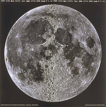 最寬幅的月面實景圖,由對半之月球實景照片組合而成,清晰的呈現月球地貌所有的細節,立克天文台所攝,海報上方有月球之各國語文。